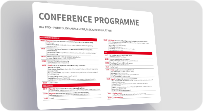 CONFERENCE PROGRAMME DAY TWO – PORTFOLIO MANAGEMENT, RISK AND REGULATION PORTFOLIO MANAGEMENT 13:30 CEO Panel: What are the right guiding principles for AI applications in Capital Markets? 09:00 Keynote: The journey of AI/ML in quantitative trading strategies so far, and what’s really Chair – Professor Dave Cliff, Professor of Computer Science / Head of Merchant Venturers’ School of possible now? Engineering, Bristol University Professor Steve Roberts, Director, Oxford-Man Institute & Professor of Information Engineering, Marty Chavez, CIO, Goldman Sachs (tbc) University of Oxford Anthony Ledford, CIO, Man AHL Chris Corrado, Group CIO, London Stock Exchange Group (tbc) 09:30 How machine learning can help overcome mathematical intractability in some portfolio Andrew Bailey, Head of FCA (tbc) selection methods. RISK Yves-Laurent Kom Samo, Google Scholar in Machine Learning, DPhil student, Oxford-Man Institute of Quantitative Finance 14:10 Using machine learning to identify insider trading 09:50 Fintech’s approach to AI & Data applications in Capital Markets Dr Tom Doris, CEO, OTAS Technologies Dr Tristan Fletcher, Research Director, Thought Machine 14:30 Supercomputers that watch supercomputers 10:10 Stochastic filtering in electronic trading Anthony D. Amicangioli, Founder and CEO, Hyannis Port Research Paul A. Bilokon, Director at Thalesians Ltd 14:50 Protecting portfolios from tail risk and grey swans 10:30 Panel: What are the implications of AI for discretionary / fundamental Dr Jeremy Sosabowski, CEO, AlgoDynamix investment strategies? 15:10 Coffee break Chair - Professor Steve Roberts, Director, Oxford-Man Institute & Professor of Information Engineering, 15:30 Panel: Would machines have manipulated Libor? University of Oxford Chair – Roland Fejfar, VP Fintech IDB, Morgan Stanley Yves-Laurent Kom Samo, Google Scholar in Machine Learning, DPhil student, Oxford-Man Institute of Dr Tom Doris, CEO, OTAS Technologies Quantitative Finance Anthony D. Amicangioli, Founder and CEO, Hyannis Port Research Dr Tristan Fletcher, Research Director, Thought Machine Dr Jeremy Sosabowski, CEO, AlgoDynamix Paul A. Bilokon, Director at Thalesians Ltd Rod Hall, Senior Analyst, US Networking & IT Hardware Equity Research, JP Morgan Chase & Co. 16:10 Panel: The future of AI & data science in Capital Markets 11:10 Coffee break Chair – Professor Dave Cliff, Professor of Computer Science / Head of Merchant Venturers’ School of Engineering, Bristol University REGULATION Professor Steve Roberts, Oxford-Man Institute & Professor of Information Engineering, 11:30 Keynote: The intersection of technology, finance and regulation University of Oxford Dr Andrei Kirilenko, Director, Centre for Global Finance & Technology, Imperial College Business School Rod Hall, Senior Analyst, US Networking & IT Hardware Equity Research, JP Morgan Chase & Co. Anthony Ledford, CIO, Man AHL 12:00 Keynote: How to regulate the brave new world of advancing algorithms Further panel members to be announced Edwin Schooling Latter, Head of Markets Policy, Financial Conduct Authority (tbc) 16:50 Closing remarks 12:30 Lunch Professor Nick Jennings CB, FREng, Vice-Provost (Research) at Imperial College 20:00 Conference close