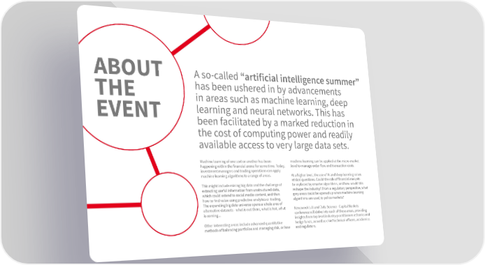 ABOUT A so-called “artificial intelligence summer” THE has been ushered in by advancements in areas such as machine learning, deep EVENT learning and neural networks. This has been facilitated by a marked reduction in the cost of computing power and readily available access to very large data sets. Machine learning of one sort or another has been machine learning can be applied at the micro-market happening within the financial arena for some time. Today, level to manage order flow and transaction costs. investment managers and trading operations can apply machine learning algorithms to a range of areas. At a higher level, the use of AI and deep learning raises ethical questions. Could the role of financial analysts This might include mining big data and the challenge of be replaced by smarter algorithms, and how would this extracting useful information from unstructured data, reshape the industry? From a regulatory perspective, what which could extend to social media content, and then grey areas could be opened up when machine learning how to find value using predictive analytics or trading. algorithms are used to police markets? The expanding big data universe opens a whole area of alternative datasets - what is out there, what is hot, what Newsweek’s AI and Data Science - Capital Markets is coming... conference will delve into each of these areas, providing insights from top level industry practitioners at banks and Other interesting areas include advanced quantitative hedge funds, as well as chief technical officers, academics methods of balancing portfolios and managing risk, or how and regulators.