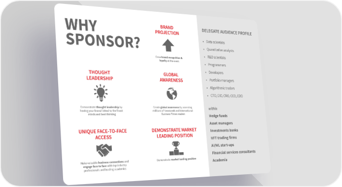 BRAND DELEGATE AUDIENCE PROFILE PROJECTION WHY • Data scientists SPONSOR? • Quantitative analysts Grow brand recognition & • R&D scientists loyalty at the event • Programmers THOUGHT GLOBAL • Developers LEADERSHIP AWARENESS • Portfolio managers • Algorithmic traders • CTO, CIO, CRO, CCO, COO Demonstrate thought leadership by Create global awareness by accessing within having your brand linked to the finest millions of Newsweek and International minds and best thinking Business Times readers Hedge funds Asset managers UNIQUE FACE-TO-FACE DEMONSTRATE MARKET Investments banks ACCESS LEADING POSITION HFT trading firms AI/ML start-ups Financial services consultants Make valuable business connections and Demonstrate market leading position Academia engage face to face with top industry professionals and leading academics